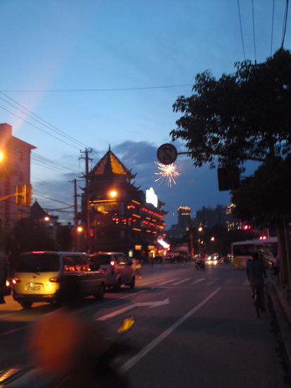 09/07/07 龙华 华灯初下的路上,行人匆匆,龙华附近放起了绚烂的烟花,我想这烟花应该是湖南家乡来的吧!