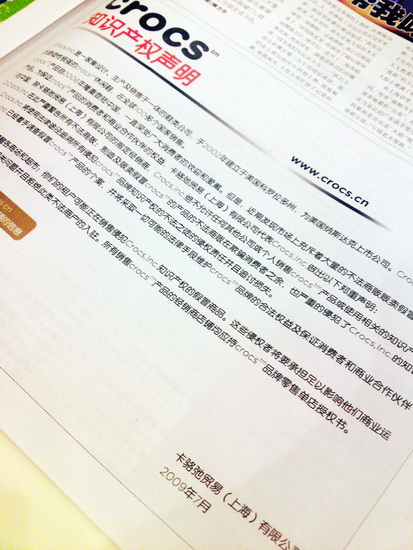 2009/08/03 哈,不知道这算不算变相广告宣传,我也做一回免费推广人吧,只不过今天最大的事情要算我看到了Crocs发飙的公文了!也许你不认识Crocs这个品牌,但是你一定知道满大街的洞洞鞋,那种远看不怎么好看,近看也不咋地的貌似拖鞋的凉鞋,听说穿着很舒服,哈,我也没有试过,只不过要是以我的性格通常这样的新鲜玩意我会去试试的,但是当满大街都有的东西的时候,我是肯定不会再沾边的。何况大街上绝大多数都是从小摊小贩上买的山寨版……