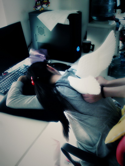 2009/08/25 带翅膀的到底是天使还是鸟人这个其实我们不用深究哈,正如天使鸟人这个名词其实也还蛮好听的嘛,茶余饭后,同事在街道上捡到一个泡沫雕刻的凤凰,于是便成了办公室内的一大热门话题,带翅膀,做头盔,哈哈,反正就是翅膀能玩的都玩尽了吧。拥有一番童真还正是好事啊!