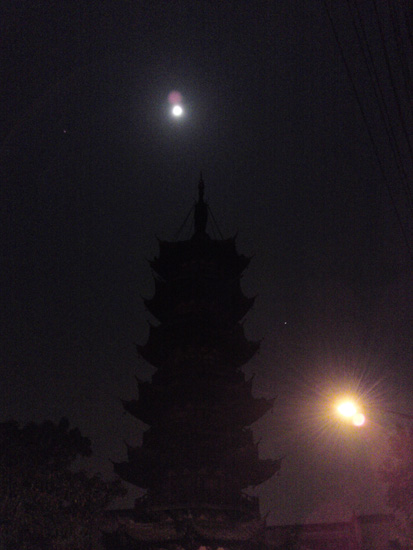 十五的月亮十六圆,这一天是七月十六,月亮果然很圆啊!嘿嘿。在这个花好月圆之夜,怎能不拍一张留念呢,只是可惜我的手机在这个时候实在是有点力不从心了,在龙华寺前拍摄的街灯-古塔-明月 嗯听上去应该还是蛮有意境的吧,哈哈。