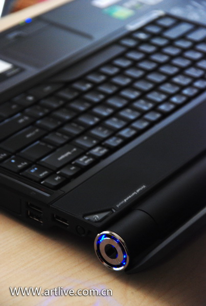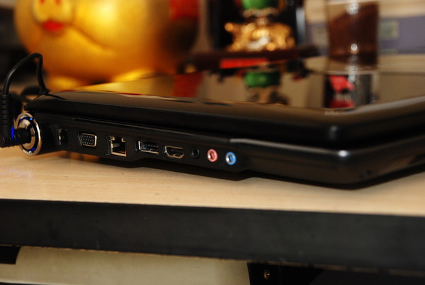 机器的左侧面接口非常丰富,AC电源插孔被非常巧妙地设计在机器转轴处,采用了亮银金属质感的设计,内嵌蓝色灯光链接上电源后感觉非常迷幻。从左只有一次排列着Modem接口、VGA接口、RJ45接口、E-Sata接口、HDMI接口、音频接口,在左前方还设置了一个红外线接收器和一个六合一读卡器,可以兼容SD、MMC、MMCPlus、MS、MS Pro、XD卡。