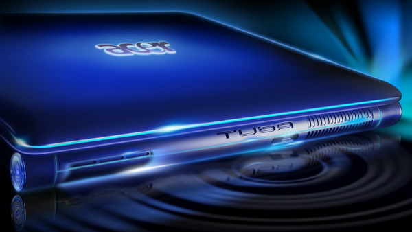机器背面采用了非常大气的设计,夸张的散热孔不仅让这款本身体积不小的本看上去非常豪放,也增强了机器的散热性能。中间独特的TUBA字样预示着这款机器是有TUBA Chie Bass重低音喇叭的。
