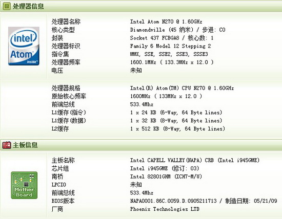 处理器: INTEL ATOM N270 主频:1.6GHz