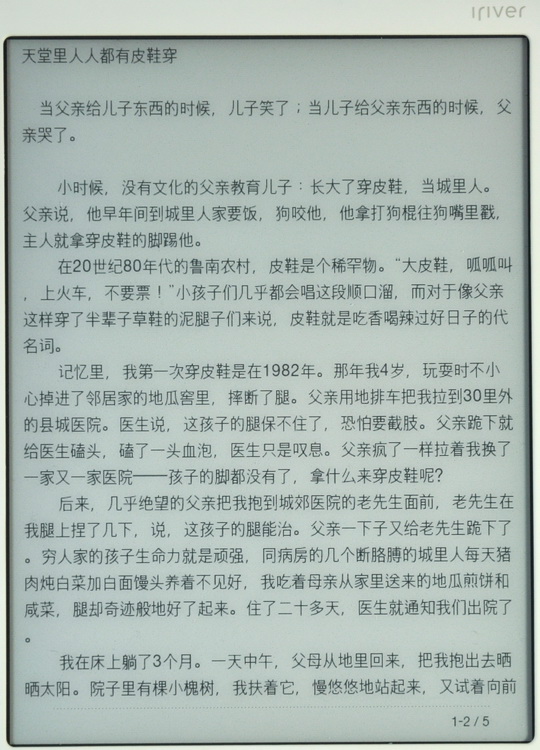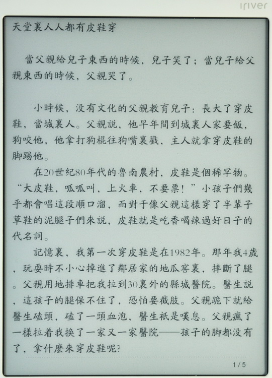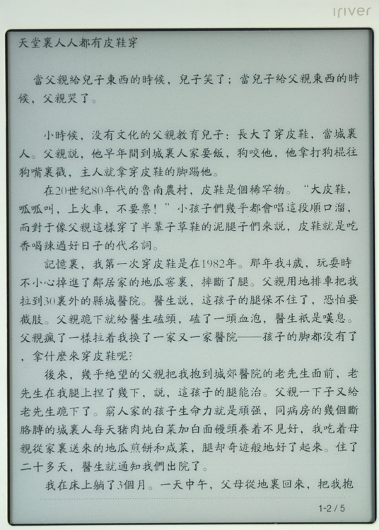 在测试中我们惊喜的发现iriver story的显示角度非常优秀,完全可以跟印刷书籍相媲美了,实现任意角度阅读都清晰的效果。
