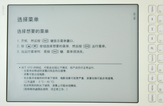 测试完TXT再让我们看看iriver story对PDF格式支持怎么样,这里使用iriver story机器内自带的说明书,文件大小为6.1M,打开时间约为5秒。