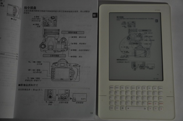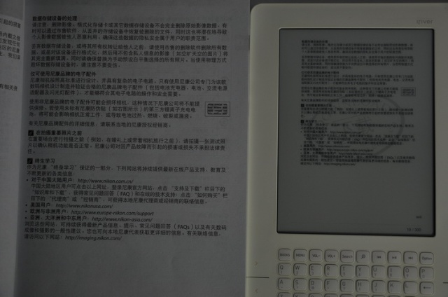 为了更好的对比iriver story显示效果与印刷书籍的区别,我在这里特意找来同样内容的书籍电子档和印刷版进行对比。使用的是 尼康D90的说明书(由于下载的电子书加密了,有个水印,各位无视哈)