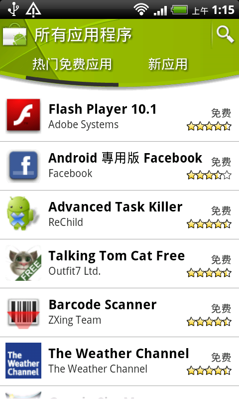 机器内所有程序,基本上全部的都在这里(91手机助手是刷机后安装的,还有“语音搜索”和“桌面时钟”两个图标没有截下来。