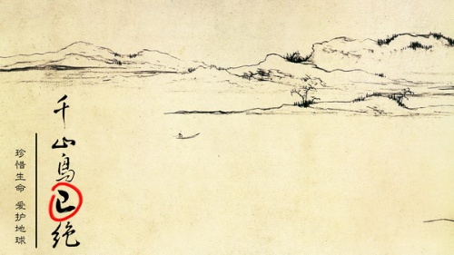 运用国画的轻描淡写加上中文书法,把千古名流人们熟悉的古诗加以改用“千山鸟已绝”让人突发深思,不要等到这样的千古名诗真的有一天变其味,改其质才知道悔之晚矣!珍惜生命,不仅仅是人类自己的生命,而是世间万物的生命,爱护地球。