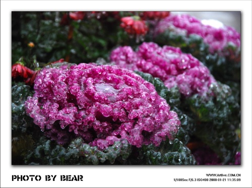 看看这些羽衣甘蓝完全被冰裹着,像是一朵朵水晶花儿。